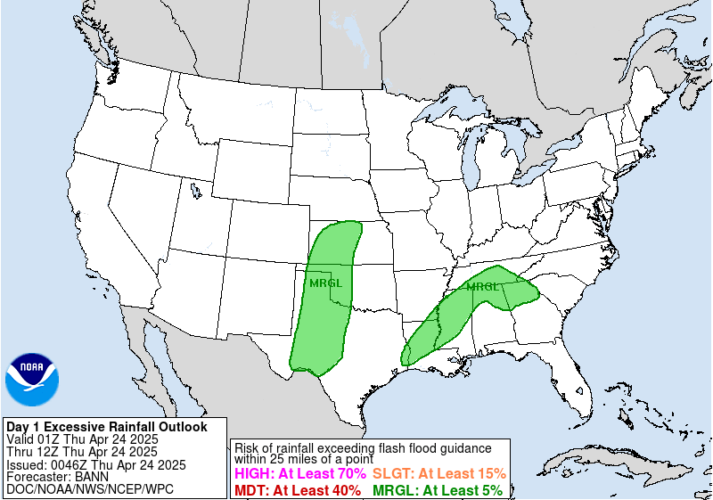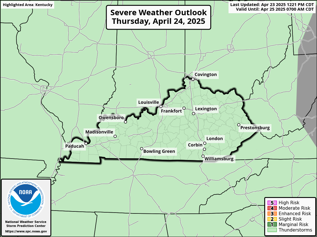 | THUNDERSTORMS (no label)(light green) | No severe* thunderstorms expected. Lightning/flooding threats exist with all thunderstorms. | Winds to 40 mph. Small hail. |